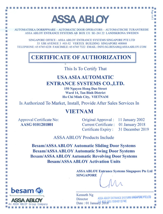 Chú ý: chỉ có MYACO là công ty Đại diện độc quyền phân phối Cửa tự động Assa Abloy (Besam)(Distributor) tại VN mà thôi.